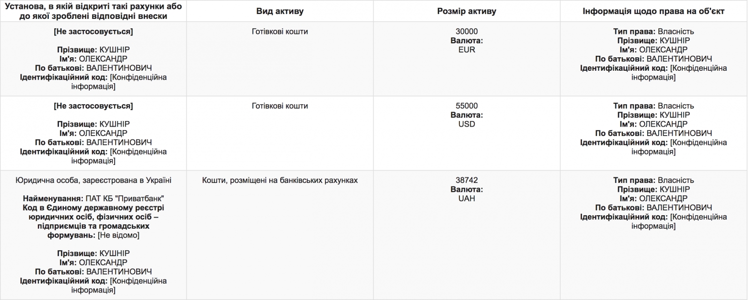 При этом у него и его супруги есть значительные финансовые сбережения. Так, Александр Кушнир задекларировал 30 тысяч евро, 55 тысяч долларов США и 38 тысяч 742 гривны на банковском счету. В то же время, согласно декларации, у его жены есть 20 тысяч евро, 30 тысяч долларов, а также 4 тысячи 246 гривен на банковском счету.