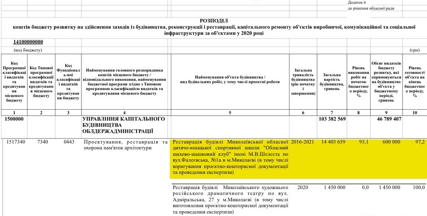Одним из объектов, на ремонт которого планируется выделить деньги, является реставрация здания Николаевской областной детско-юношеской спортивной школы «Областной шахматно-шашечный клуб» имени М.В. Шелеста, который находится на Набережной в Николаеве. Общая стоимость реставрации, которая началась в 2016 году, уже составляет 14 миллионов 403 тысячи гривен. Указывается, что сейчас объект отремонтирован уже на 93,1%.
