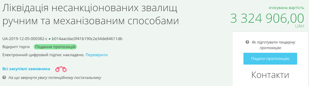 Согласно данным ресурса, 5 декабря 2019 года администрация Центрального района Николаева объявила тендер на уборку стихийных свалок ручным и механизированным способами с ожидаемой стоимостью в 3 миллиона 324 тысяч 906 гривен.