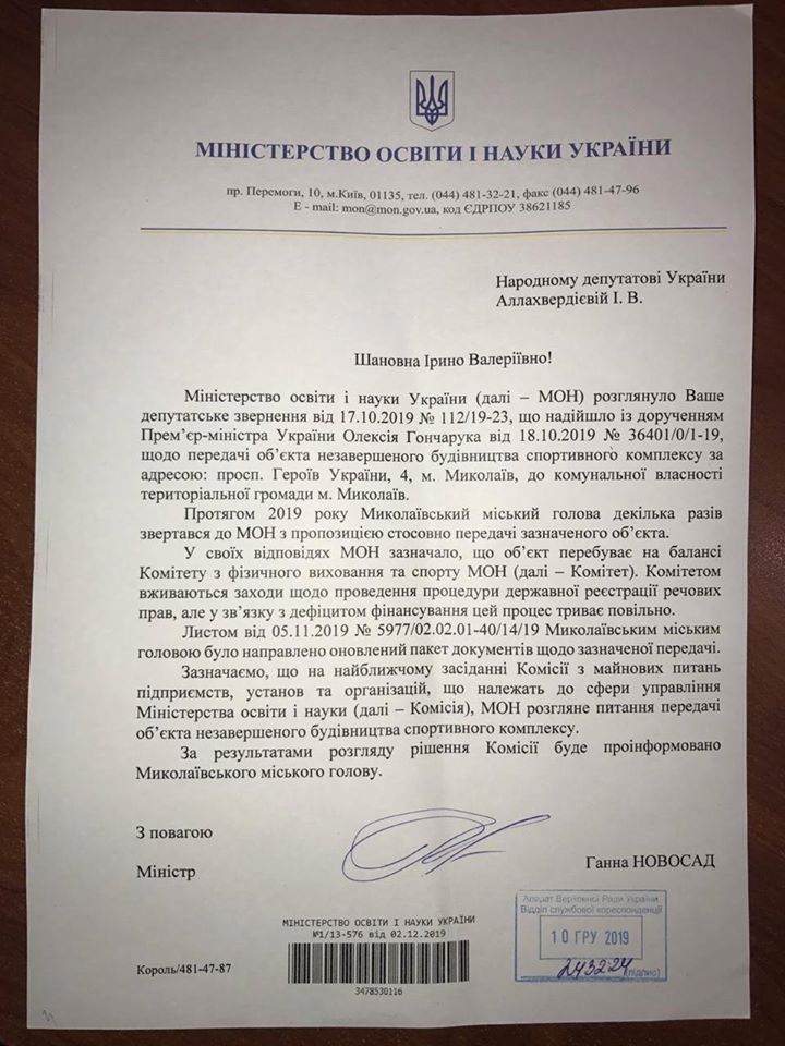 — Получила ответ от Министерства образования и науки Украины о передаче в коммунальную собственность территориальной общины Николаева спортивного комплекса по адресу - проспект Героев Украины, 4. Ответ, откровенно говоря, профессионально-бюрократический. Однако, как народный депутат, делаю все возможное, чтобы наконец решился этот вопрос в пользу общины. Хорошо, что лично Премьер-министр Украины дал поручение, чтобы Министерство отработало, то есть, до уровня формальной отписки дело не дошло, это уже хорошо. Этим вопросом занимаются на самом высоком необходимом уровне, – написала Ирина Аллахвердиева.