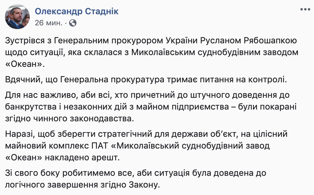 — Встретился с Генеральным прокурором Украины Русланом Рябошапкой относительно ситуации, которая сложилась с Николаевским судостроительным заводом «Океан». Благодарен, что Генеральная прокуратура держит вопрос на контроле. Со своей стороны будем делать все, чтобы ситуация была доведена до логического завершения согласно закону, - написал Александр Стадник.