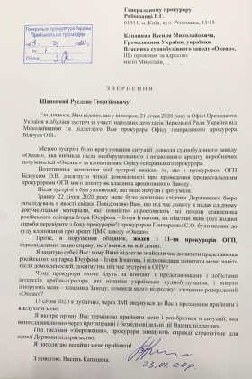 Он напомнил, что 15 января публично обратился к Генеральному прокурору Украины с просьбой принять и выслушать его. Василий Капацына снова попросил Руслана Рябошапку срочно принять его и разобраться в ситуации, «которая возникла исключительно из-за противоправных и безосновательных действий подчиненных Генпрокурора».