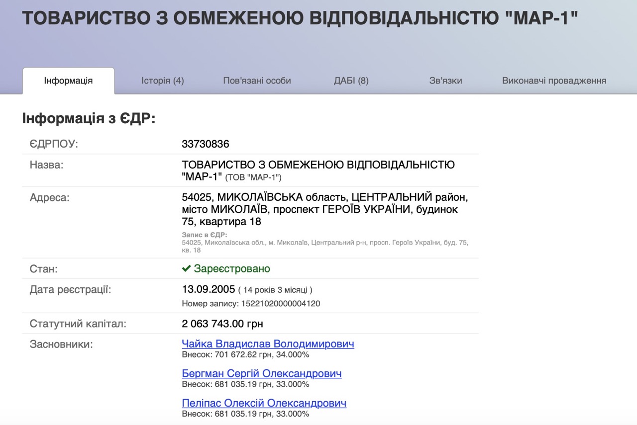 Кроме того, Владислав Чайка входит в состав учредителей компании «МАР-1», которая стала известна тем, что в 2015 году построила пиццерию «Челентано» рядом с трамвайной остановкой «Автовокзал» недалеко от зоопарка, хотя раньше там был сквер, посвященный основанию Николаева. Там же, на кольцевой развязке возле автовоказала компанией было незаконно установлено 17 билбордов. В июле 2016 года фирма «МАР-1» по требованию мэрии демонтировала 14 рекламных конструкций, которые были установлены вдоль кольца у автовокзала. Комментируя это, нынешний директор департамента по борьбе с коррупцией в мэрии Николаева Андрей Ермолаев отметил тогда, что владельцам компании, «наверное, было сделано предложение, от которого нельзя отказаться».