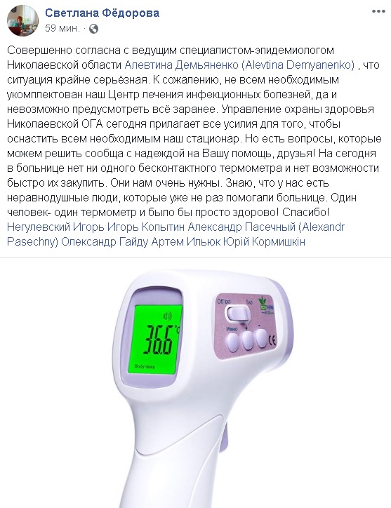 Главный врач Николаевской областной инфекционной больницы Светлана Федорова удалила из Facebook свою публикацию, в которой просила нардепов и политиков о помощи в покупке бесконтактных термометров.