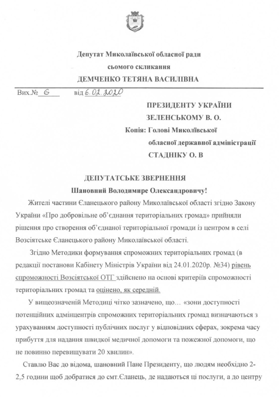 Депутат Николаевского областного совета Татьяна Демченко обратилась к президенту Украины Владимиру Зеленскомус просьбой обеспечить реализацию права жителей Еланецкого района надобровольное объединение в объединенную территориальную общину (ОТГ) с центром в селе Возсиятское.