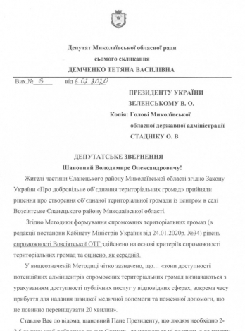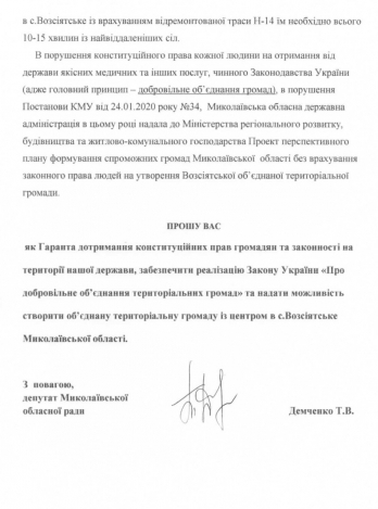 В письме говорится, что жители части Еланецкого района Николаевской области приняли решение о создании объединенной территориальной общины с центром в селе Возсиятское.