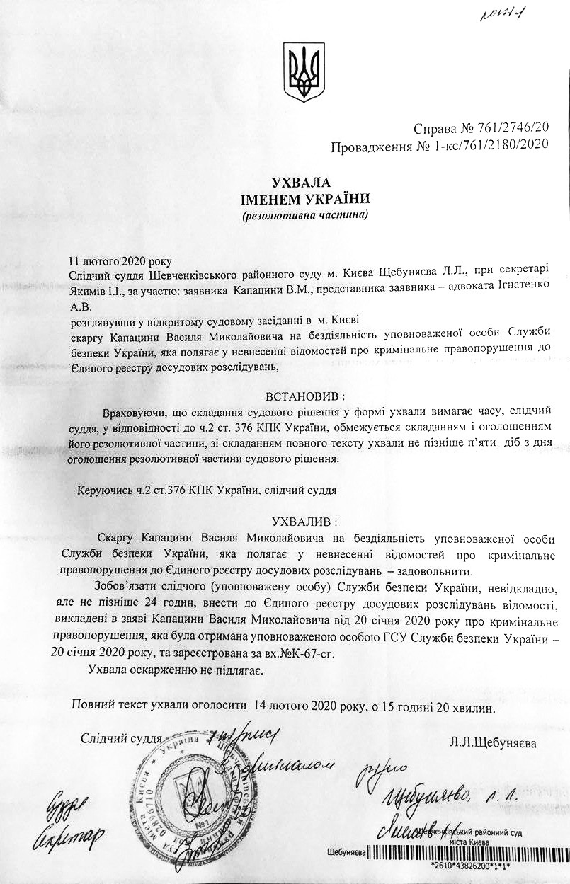 «Обязать следователя СБУ безотлогательно, но не позднее 24 часов, внести в Единый реестр досудебных расследований ведомости, изложенные в заявлении Василия Капацыны от 20 января 2020 года об уголовном производстве, которое было получено уполномоченным лицом Главного следственного управления Службы безопасности Украины - 20 января 2020 года, и зарегистрирована по вх.№К-67-сг», - говорится в резулятивной части решения следственного судьи Шевченковского райсуда Киева Лидии Щебуняевой.