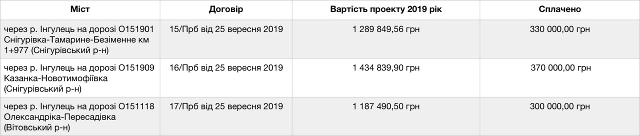 25 сентября 2019 года областное управление инфраструктуры заключило 3 договора с ООО «Альфа Форамен» на разработку проектно-сметных документаций для строительства двух мостов в Снигиревском районе и одного в Витовском. В настоящий момент завершена и оплачена лишь первая стадия проектирования.
