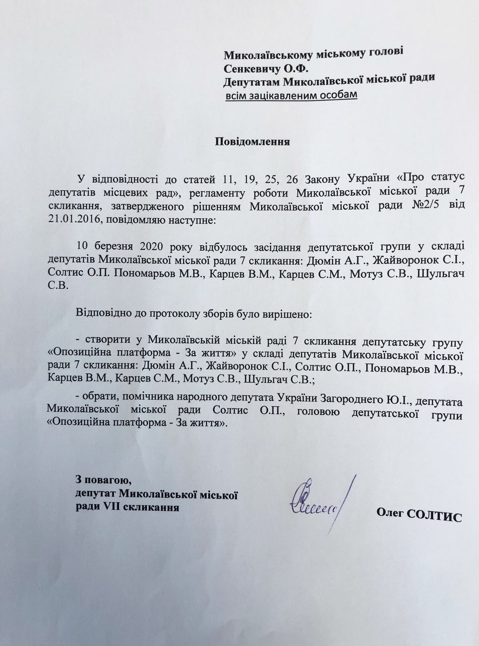 В Николаевском городском совете объявили о создании депутатской группы «Оппозиционная платформа - За життя».