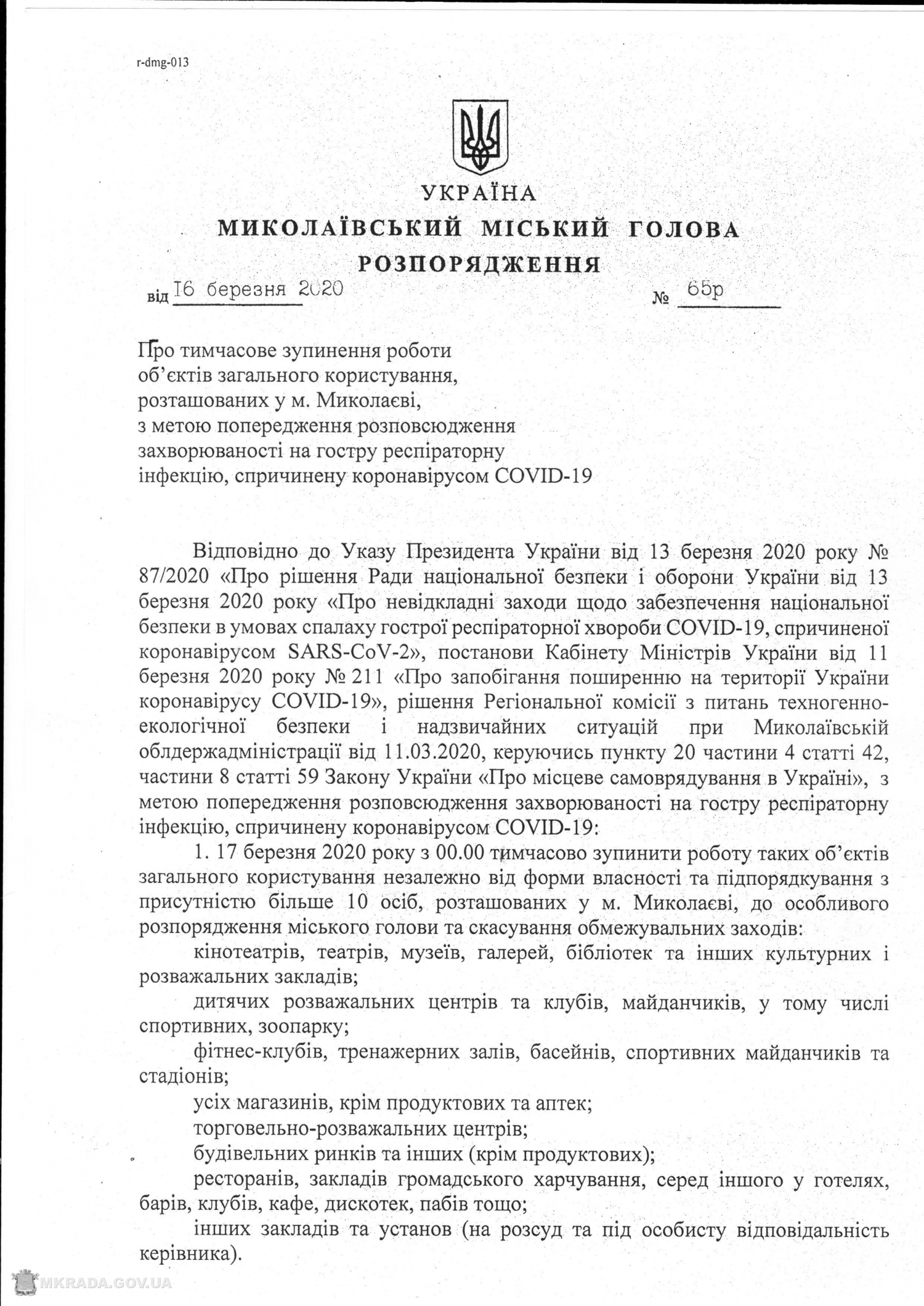 17 марта с 00:00 временно остановят работу объекты общественного пользования, незавичимо от формы собственности и подчинения с присутствием больше 10 человек в Николаеве. А именно: