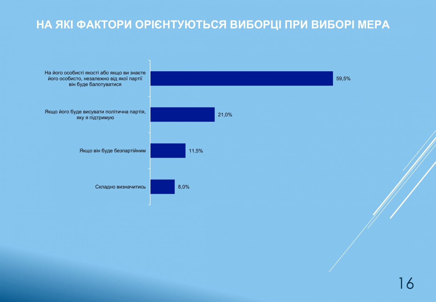 59,5% опрошенных ответили, что ключевым фактором при выборе кандидата для них будет является личное знакомство с ним и его человеческие качества. 21% ответили, что выберут кандидата в зависимости от партии, которую они поддерживают. 11,5% ответили, что проголосуют исключительно за беспартийного кандидата. Еще 8,0% затрудняются дать ответ на поставленный вопрос.