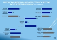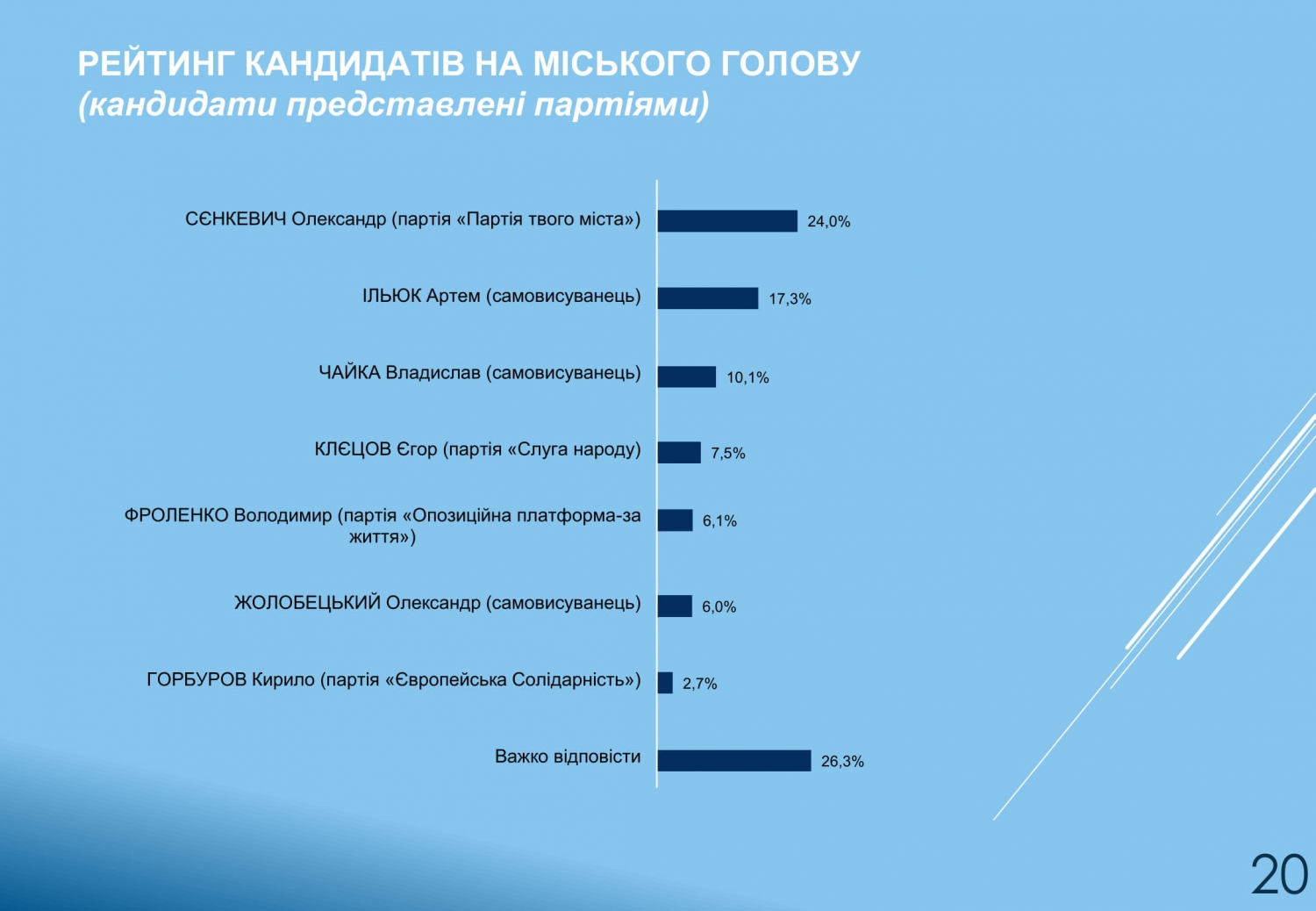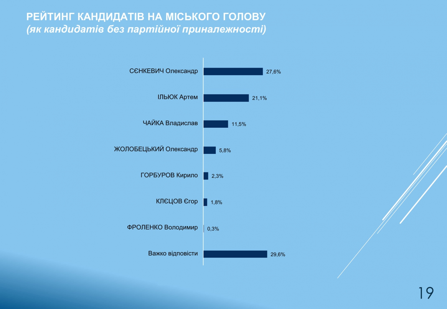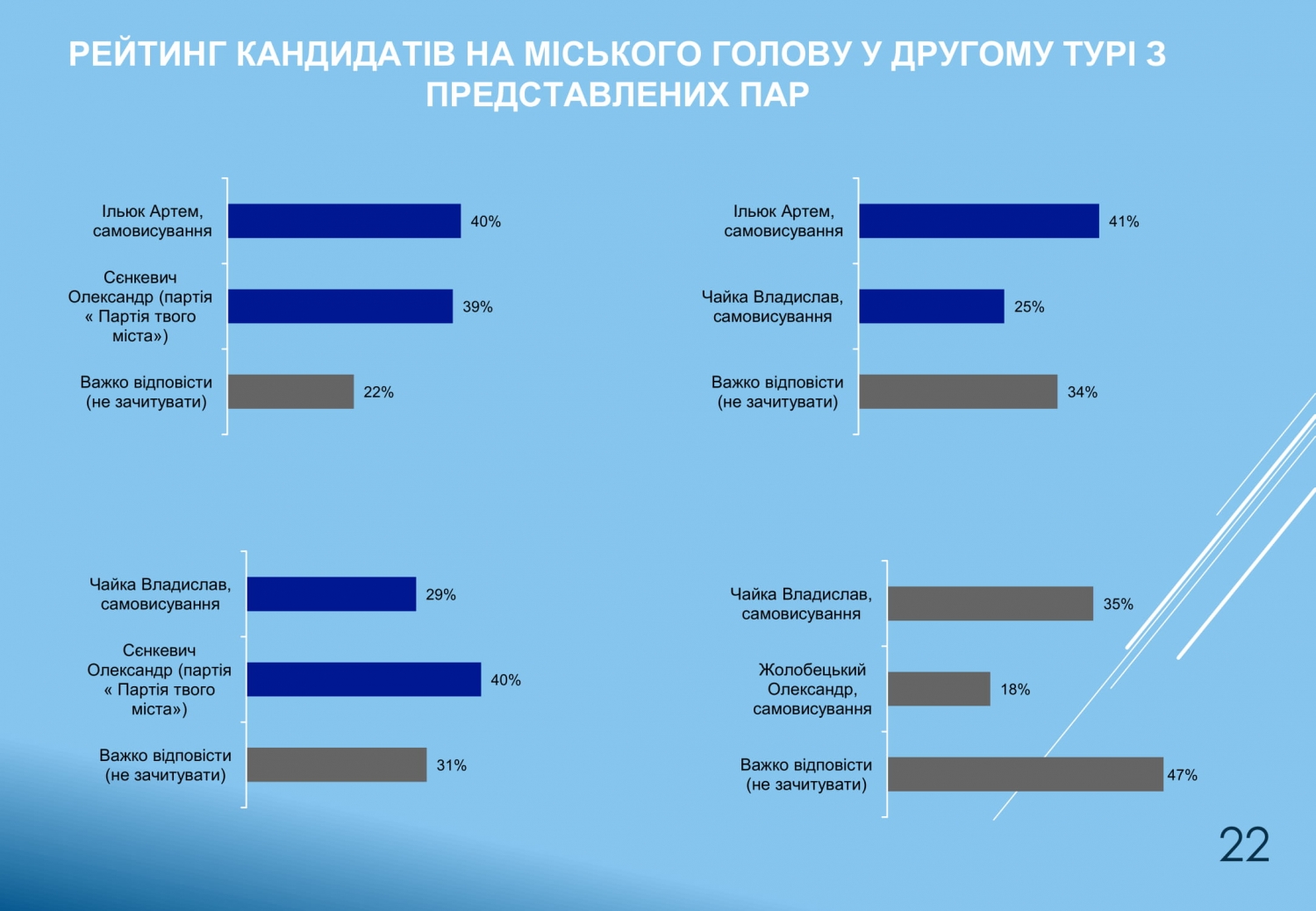 Согласно данным исследования наиболее вероятными кандидатами на выход во второй тур выборов мэра Николаева являются Александр Сенкевич и Артем Ильюк. При этом в исследовании не анализировалась кандидатура Игоря Дятлова. Указывается, что при выходе во 2 тур, Артем Ильюк побеждает у Александра Сенкевича с разницей в 1%.