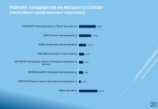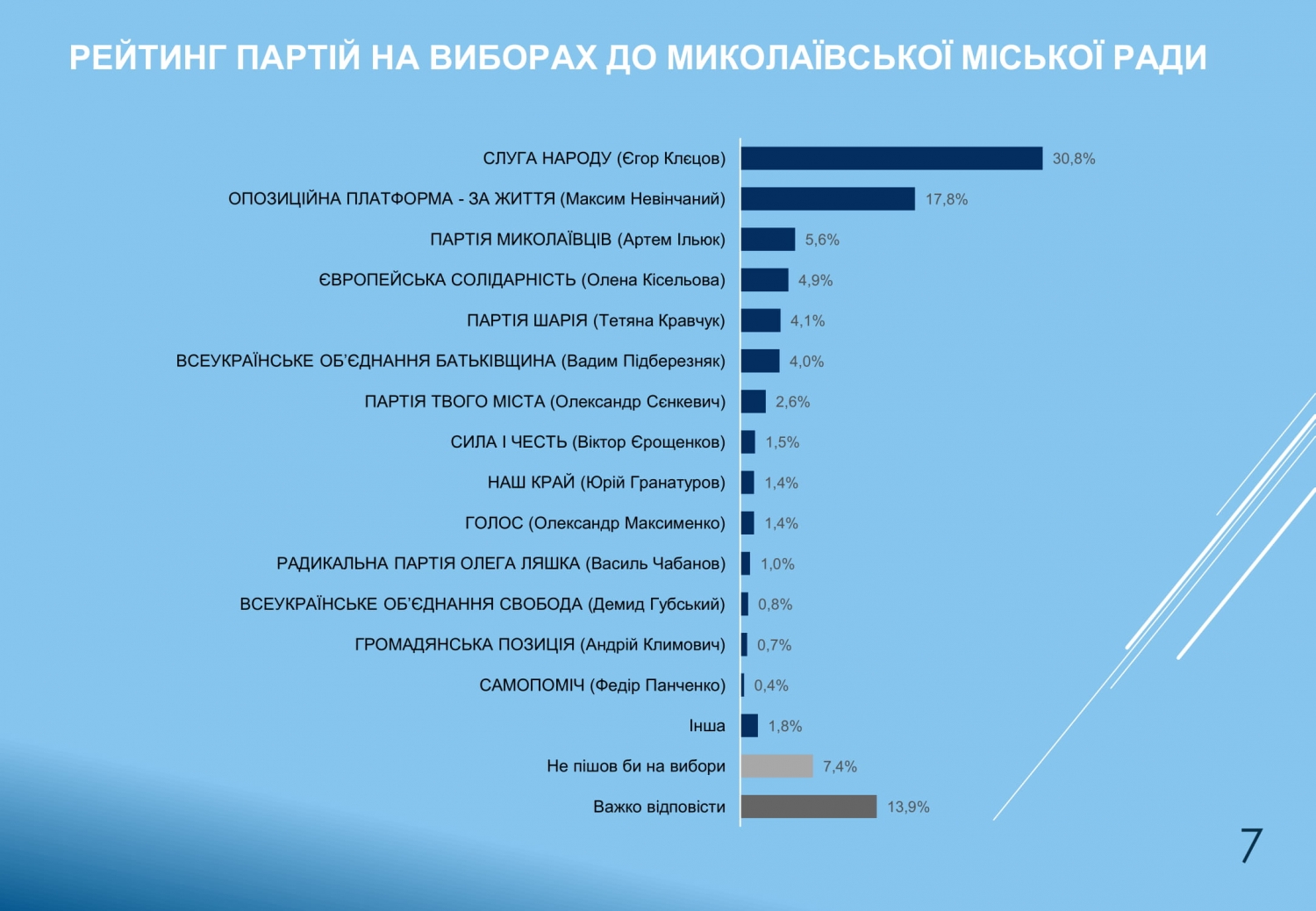Больше всего жители Николаева поддерживают партию «Слуга народа» - 30,8%. При этом 9 месяцев назад на парламентских выборах за «Слугу народа» в Николаеве проголосовало 47,8% избирателей. На втором месте «Оппозиционная платформа «За життя» - 17,8%. С учетом погрешности можно говорить, что условная «Партия николаевцев» Артема Ильюка, «Европейская Солидарность», «Партия Шария» и «Батьківщина» также могут расчитывать на преодоление пятипроцентного барьера.
