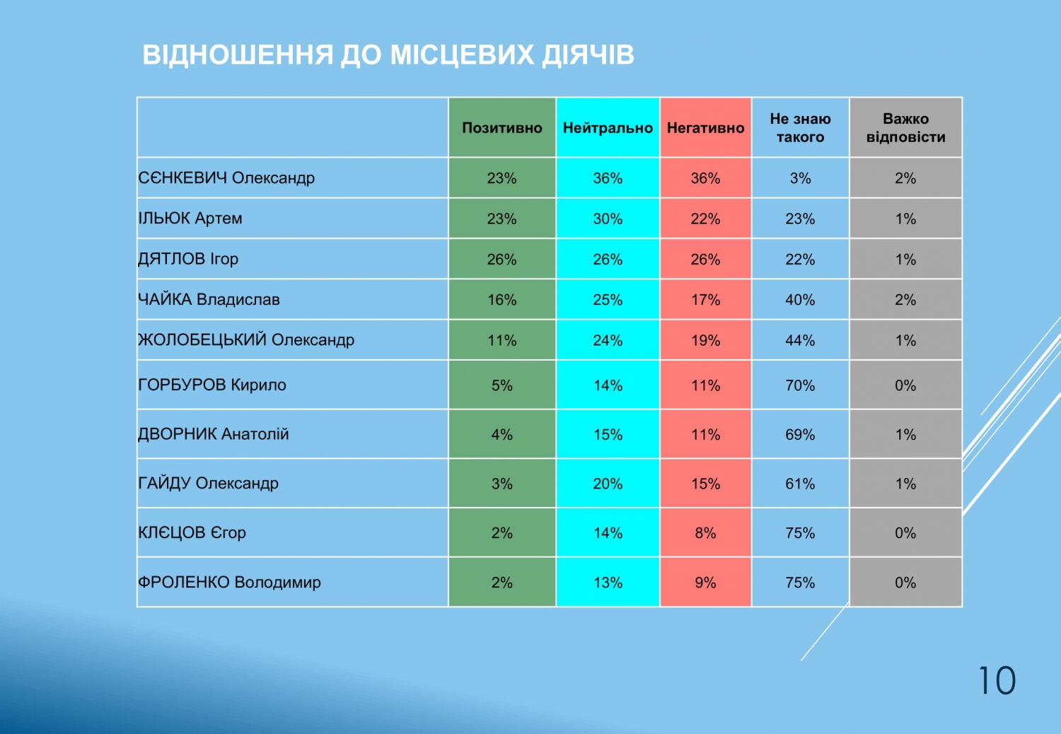 Среди местных политиков наиболее популярными являются Александр Сенкевич, Артем Ильюк и Игорь Дятлов. С учетом статистической погрешности у них примерно одинаковое количество избирателей, оценивающих их позитивно — 23%, 23% и 26% соответственно.