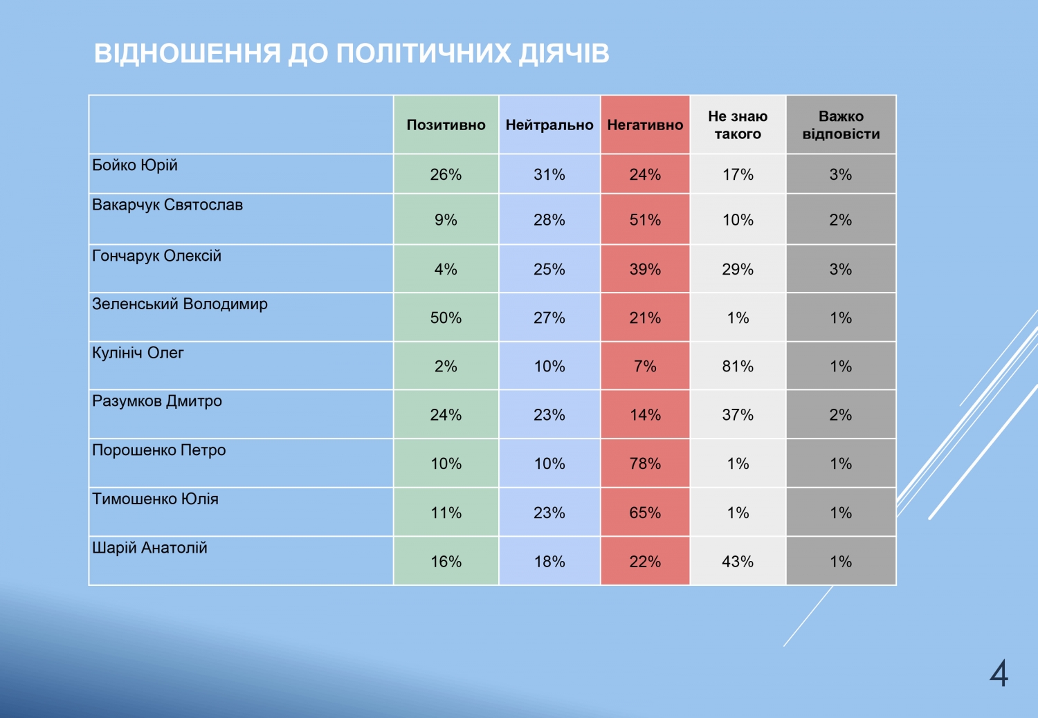 Самым популярным политиком в Николаеве по-прежнему остается Владимир Зеленский — 50% опрошенных ответили, что относятся к нему позитивно. На втором месте Юрий Бойко - 26%, на третьем Дмитрий Разумков - 24%, на четвертом Анатолий Шарий - 16%. Юлия Тимошенко - 11%, Петр Порошенко по 10%, Святослав Вакарчук - 9%.