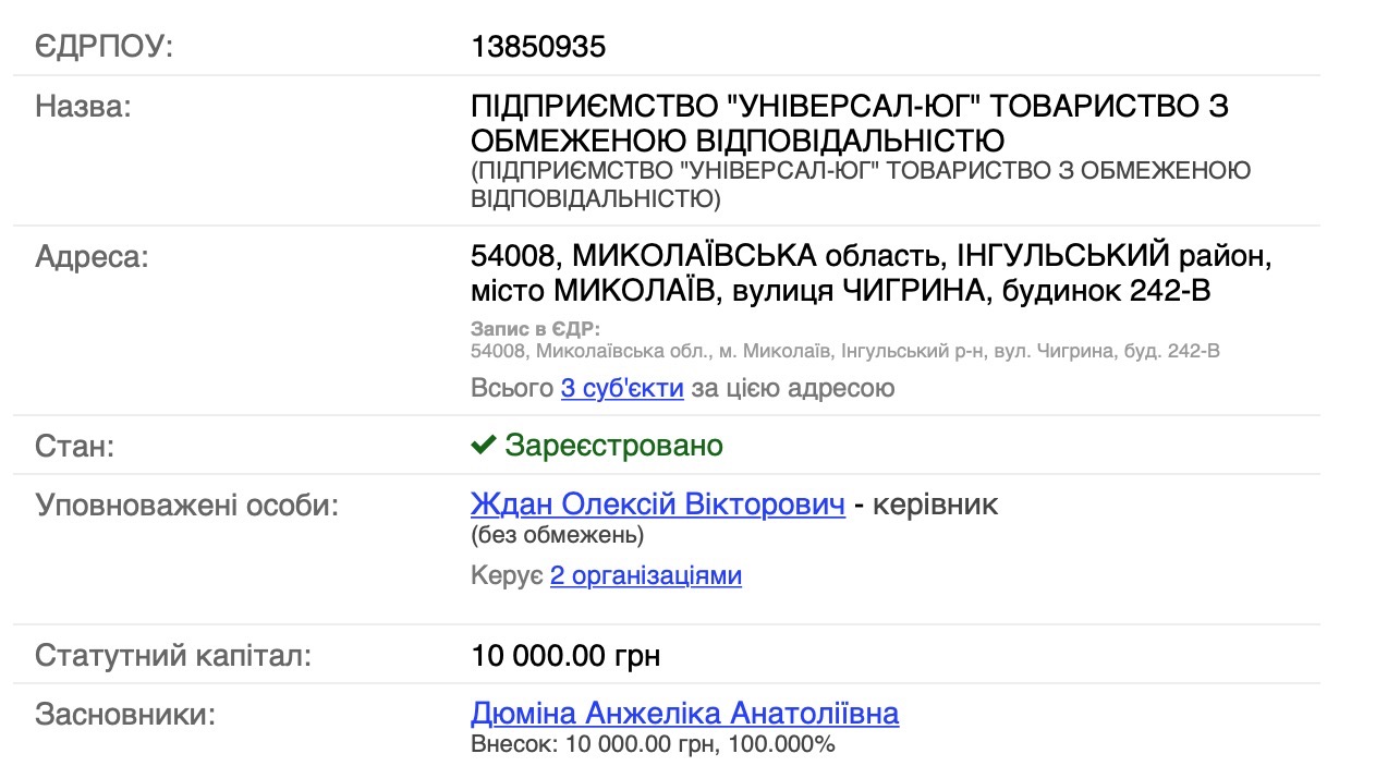 Компания «Универсал-ЮГ» зарегистрирована в Николаеве по улице Чигрина (Пограничная), 242-В. По данному адресу зарегистрировано также фермерское хозяйство «Кинбурн», владельцем которого является депутат Анатолий Дюмин. Владельцем компании «Универсал-ЮГ» числится его дочь, Анжелика Дюмина.