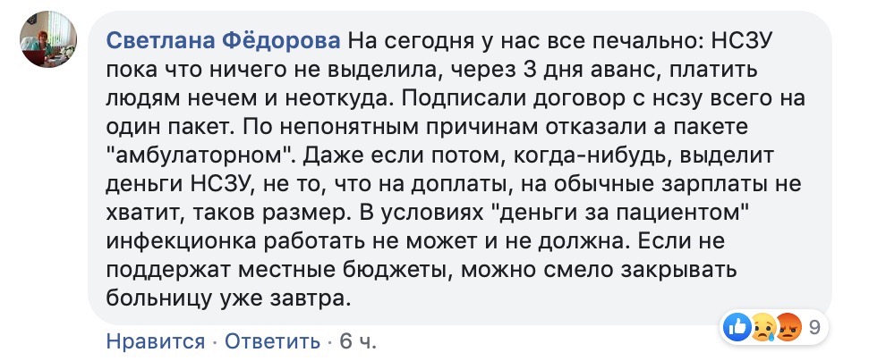 — На сегодня у нас все печально: НСЗУ пока что ничего не выделила, через 3 дня аванс, платить людям нечем и неоткуда. Подписали договор с НСЗУ всего на один пакет. По непонятным причинам отказали а пакете «амбулаторном». Даже если потом, когда-нибудь, выделит деньги НСЗУ, не то, что на доплаты, на обычные зарплаты не хватит, таков размер. В условиях «деньги за пациентом» инфекционка работать не может и не должна. Если не поддержат местные бюджеты, можно смело закрывать больницу уже завтра, - написала Светлана Федорова.