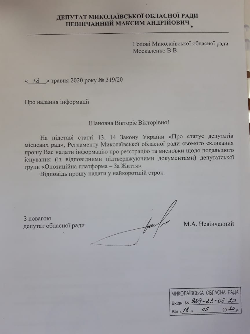 Такое заявление Владимир Фроленко сделал на свой странице в социальной сети Facebook опубликовав запрос Максима Невенчанного к главе Николаевского облсовта Виктории Москаленко с просьбой предоставаить регистрационные документы депутатской группы «ОПЗЖ».