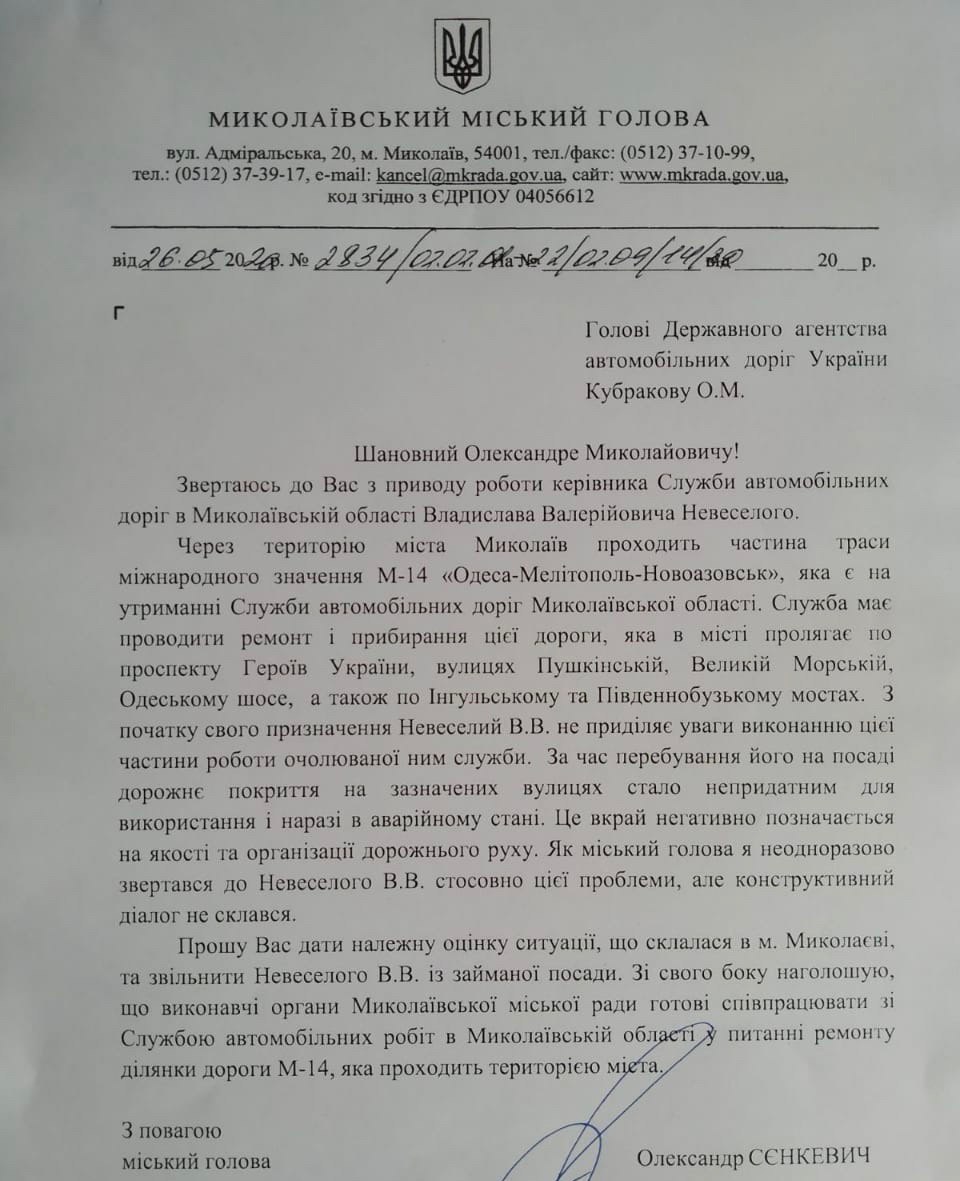 Мэр Николаева Александр Сенкевич обратился к главе Укравтодора Александру Кубракову с просьбой освободить от занимаемой должности руководителя Службы автомобильных дорог в Николаевской области Владислава Невеселого.