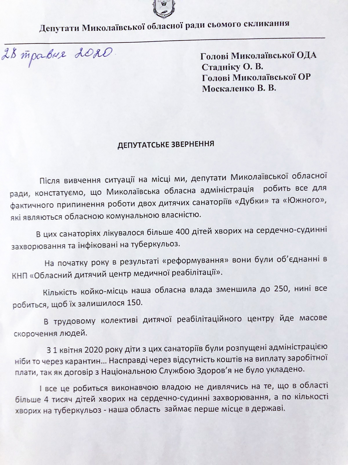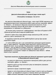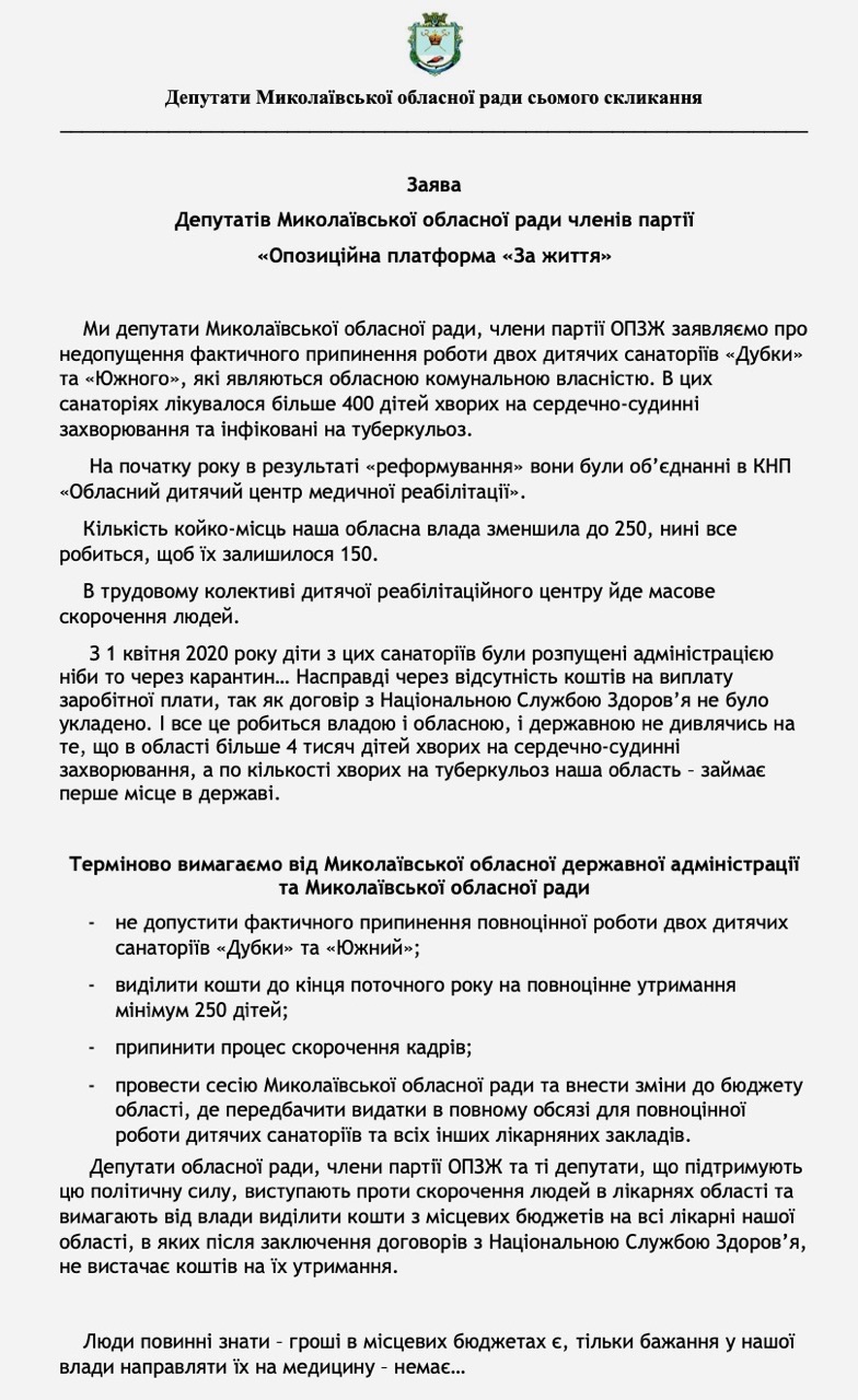 Депутаты Николаевского областного совета, члены партии «Оппозиционная платформа - За життя» выступили с заявлением о недопущении фактического прекращения работы двух детских санаториев «Дубки» и «Южного», которые являются областной коммунальной собственностью. В этих санаториях лечилось более 400 детей больных сердечно-сосудистыми заболеваниями и инфицированных туберкулезом.