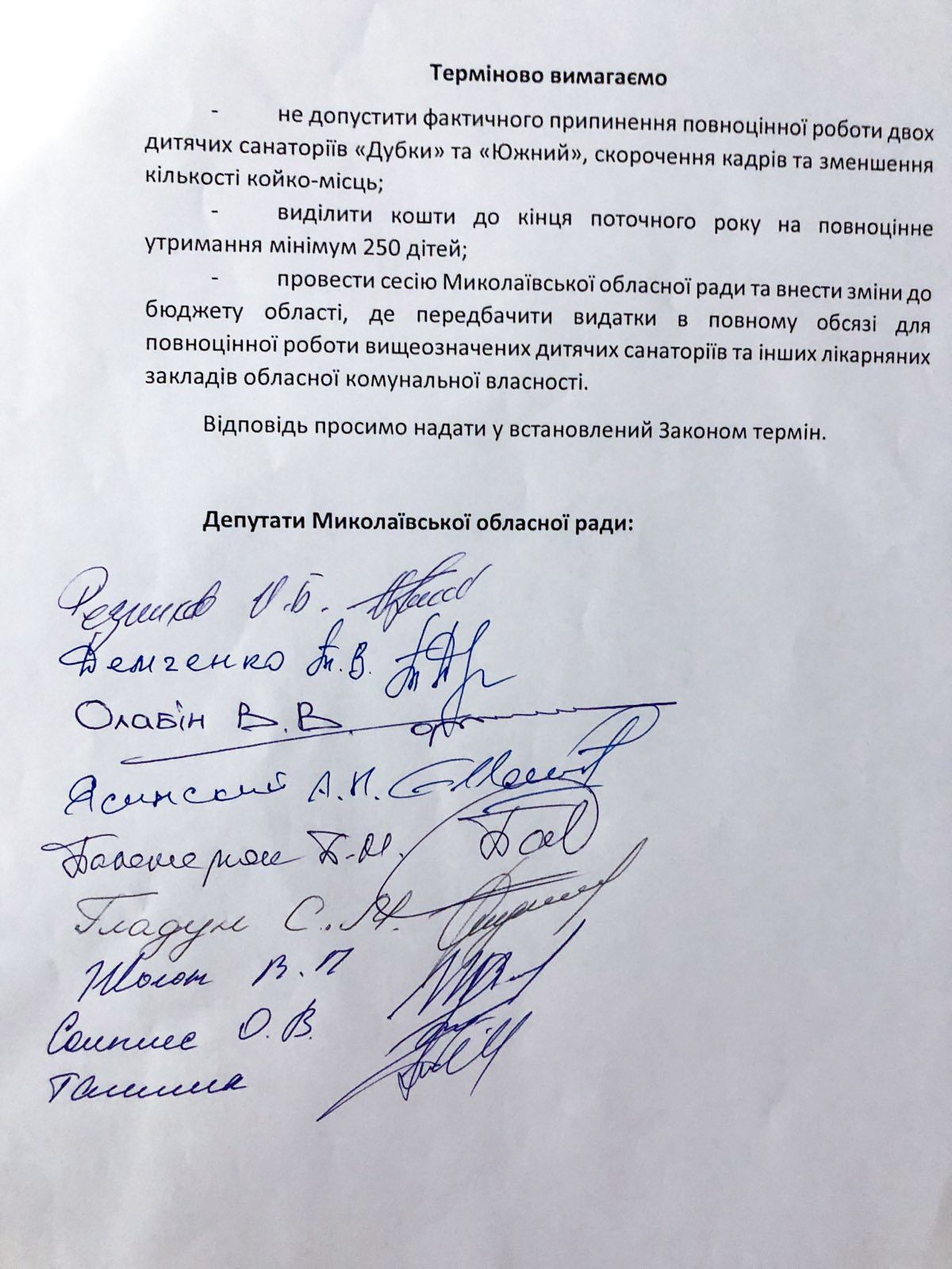 Общими и для заявления, и для обращения, являются следующие требования выделить средства до конца текущего года на полноценное содержание минимум 250 детей; прекратить процесс сокращения кадров; провести сессию Николаевского областного совета и внести изменения в бюджет области, где предусмотреть расходы в полном объеме для полноценной работы детских санаториев и всех других лечебных учреждений.