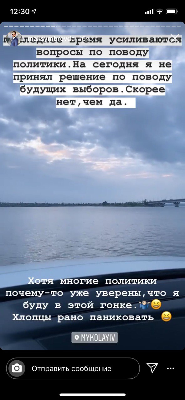 Он рассказал, что в последнее время его часто спрашивают о политике, и заявил, что он пока не принял решение по поводу будущих местных выборов. Вероятно, Максим Бревда имеет ввиду местные выборы, которые пройдут осенью этого года.