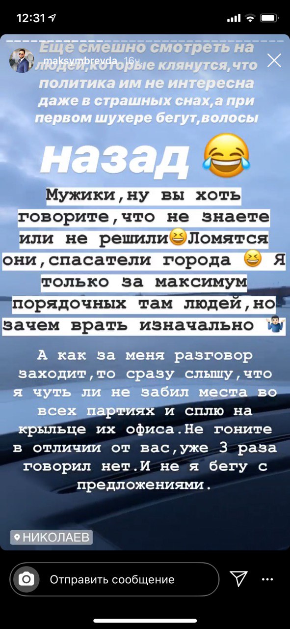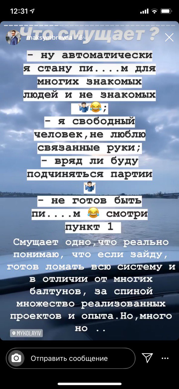 «Последнее время усиливаются вопросы по поводу политики. На сегодня я не принял решение по поводу будущих выборов. Скорее нет, чем да. Хотя многие политики почему-то уже уверены, что я буду в этой гонке. Хлопцы рано паниковать. Что смущает? Ну автоматически я стану пи…м для многих знакомых и не знакомых. Я свободный человек, не люблю связанные руки. Вряд ли буду подчиняться партии. Не готов быть пи…м. Смущает одно, что реально понимаю, что если зайду, готов ломать всю систему в отличии от многих балтунов, за спиной множество реализованных проектов и опыта. Но, много но…», - написал Максим Бревда.