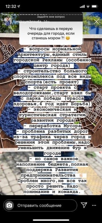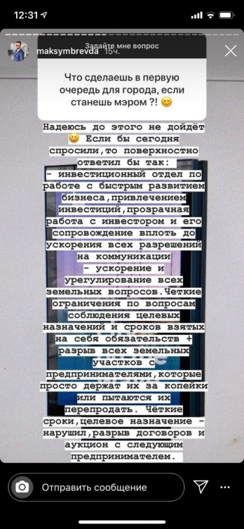 Далее активист начал отвечать на анонимный вопрос о том, что он сделает в первую очередь для города, если станет мэром. Здесь Максим Бревда написал целый список задач, которыми бы он занялся. В первую очередь, это поддержка бизнеса. Описанные им мероприятия схожа идеей президента Владимира Зеленского о создании так называемых «инвестиционных нянь» для лоббирования интересов потенциальных инвесторов.