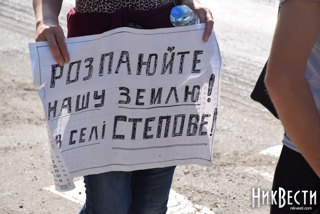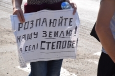 В протесте участвует около 30 человек, они безостановочно ходят по пешеходному переходу в районе с плакатами: «Требуем справедливого решения», «Распаюйте нашу землю», «ГПП «Степовое» в беде — неизвестные собирают наш урожай».