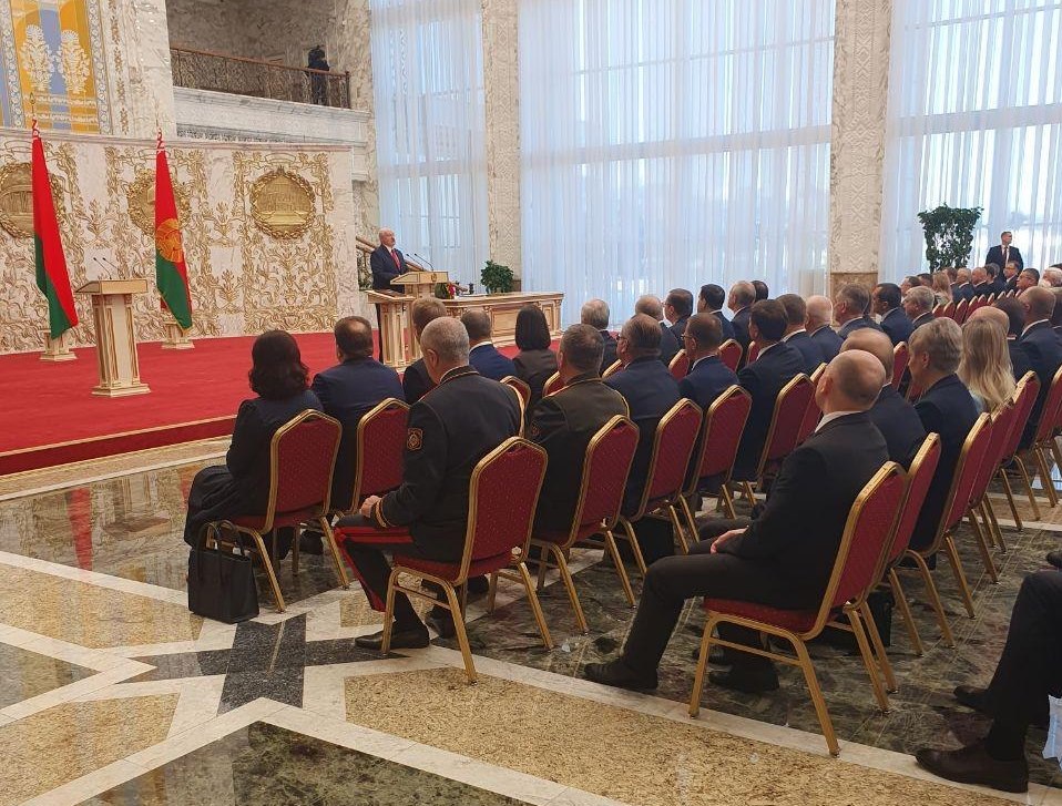 Затем он подписал акт о принесении присяги, после чего председатель Центральной комиссии Беларуси по выборам и проведению республиканских референдумов Лидия Ермошина вручила Александру Лукашенко удостоверение президента Республики Беларусь.