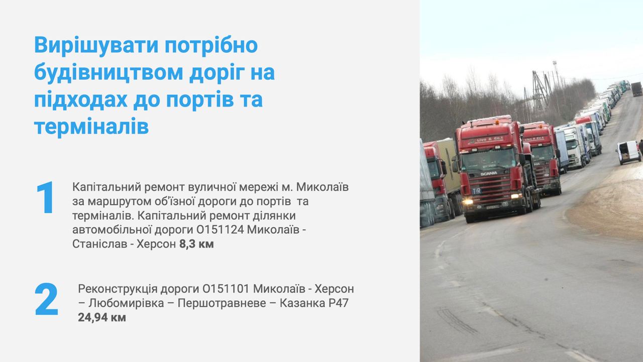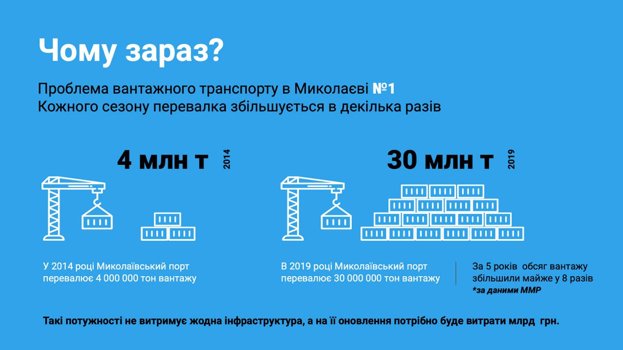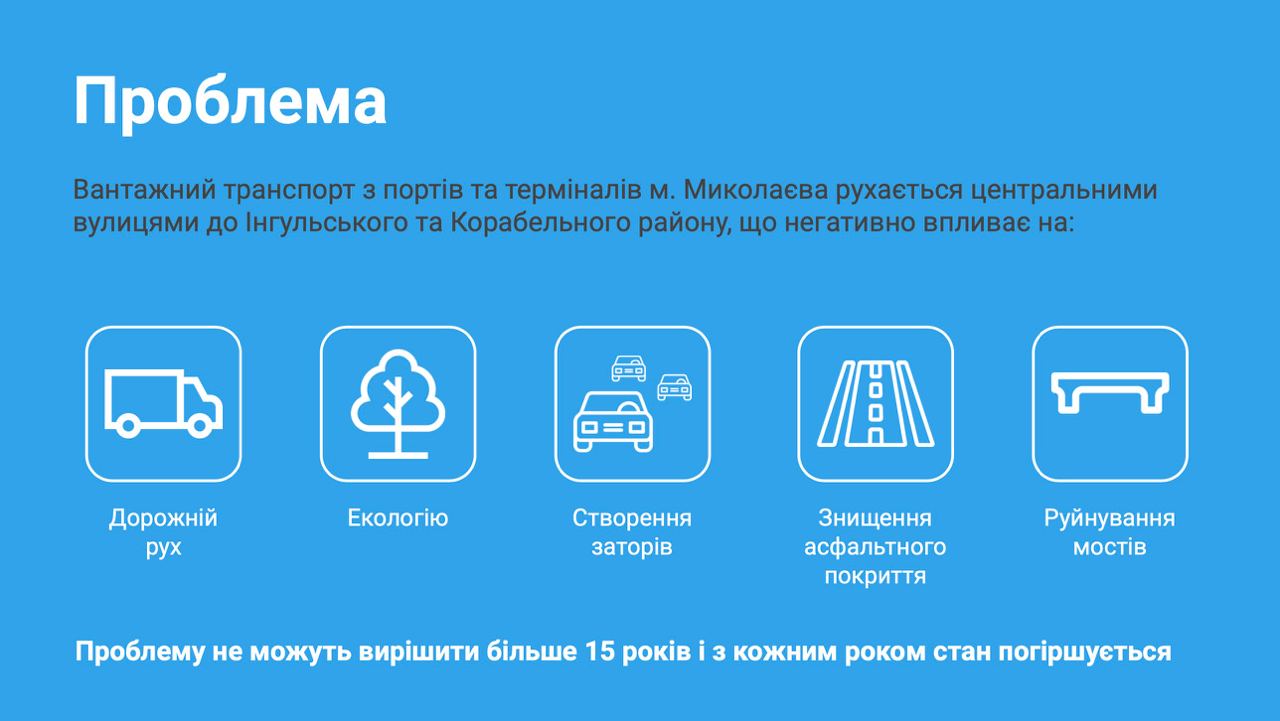 Количество перевалки груза в портовом Николаеве ежегодно растет в геометрической прогрессии. Крупногабаритный транспорт, который везет тонны груза в порты разрушает асфальтное покрытия центральных улиц города. Также это влечёт за собой огромное количество вредных выбросов в атмосферу и километровые пробки на дорогах.