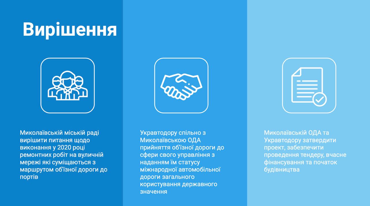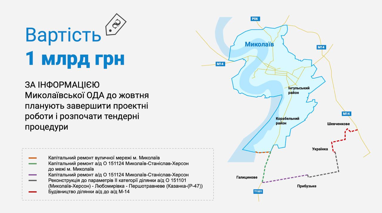 Ориентировочно стоимость реализации проекта – 1 миллиард гривен. В этом году Верховная рада Украины внесла изменения в закон о госбюджете и выделила 300 миллионов гривен на строительство бетонной объездной дороги в Витовском и Корабельном районах. В скором времени профильный департамент николаевской ОГА проведет тендерные торги на строительство первого участка объездной дороги.