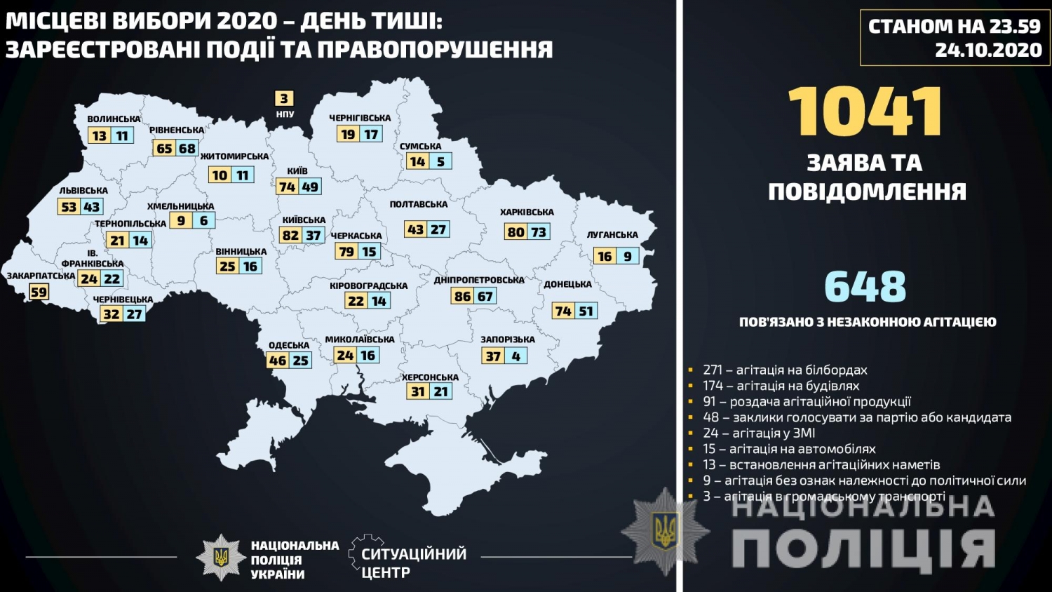 По результатам проведенных проверок составлен 1 админпротокол по статье 212-23 КУоАП «Повреждение, сокрытие, уничтожение своего избирательного бюллетеня, бюллетеня для голосования на референдуме или вынесения его за пределы помещения для голосования». В целом к охране публичного правопорядка привлечено больше 1500 полицейских, им помогают спасатели, нацгвардейцы, общественные формирования и частные охранные фирмы. Также на дежурстве находятся следственно-оперативные группы ГУНП, группы взрывотехников и кинологов.