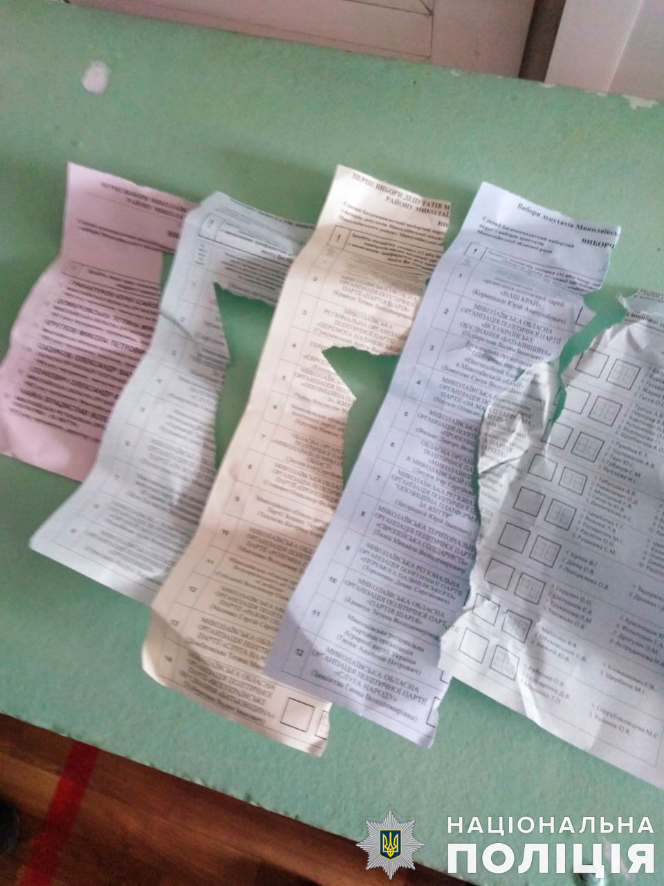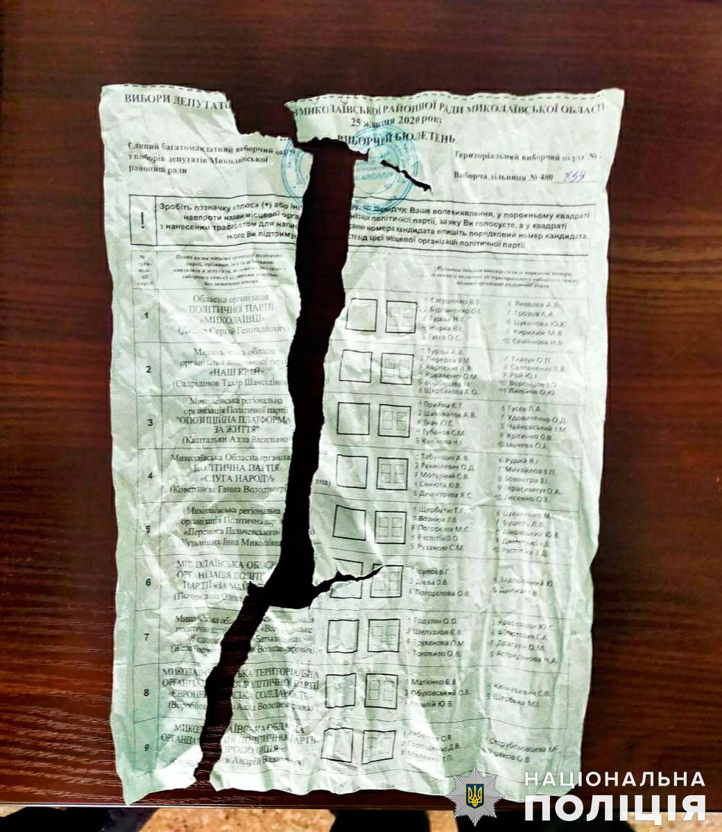 Сообщается, что 25 октября в 10:35 в полицию Ингульского района поступило сообщение о том, что человек отказался бросать в урну свой бюллетень и порвал его. На место происшествия прибыла следственно-оперативная группа для выяснения обстоятельств. Свой поступок гражданин объяснил, что таким образом выразил свой протест против всех кандидатов.