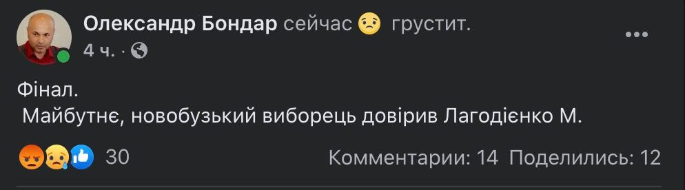 — Несмотря на огромное противодействие власти, несмотря на травлю, которую они организовали против нас, мы отстояли право людей проголосовать за нашу партию на выборах. Мы выиграли противостояние в горизбиркоме, выиграли суды и благодаря Вам получили наибольшую поддержку на выборах в городской совет! Спасибо всем Вам за доверие к нашей команде!, - написал руководитель николаевской «Оппоплатформы».