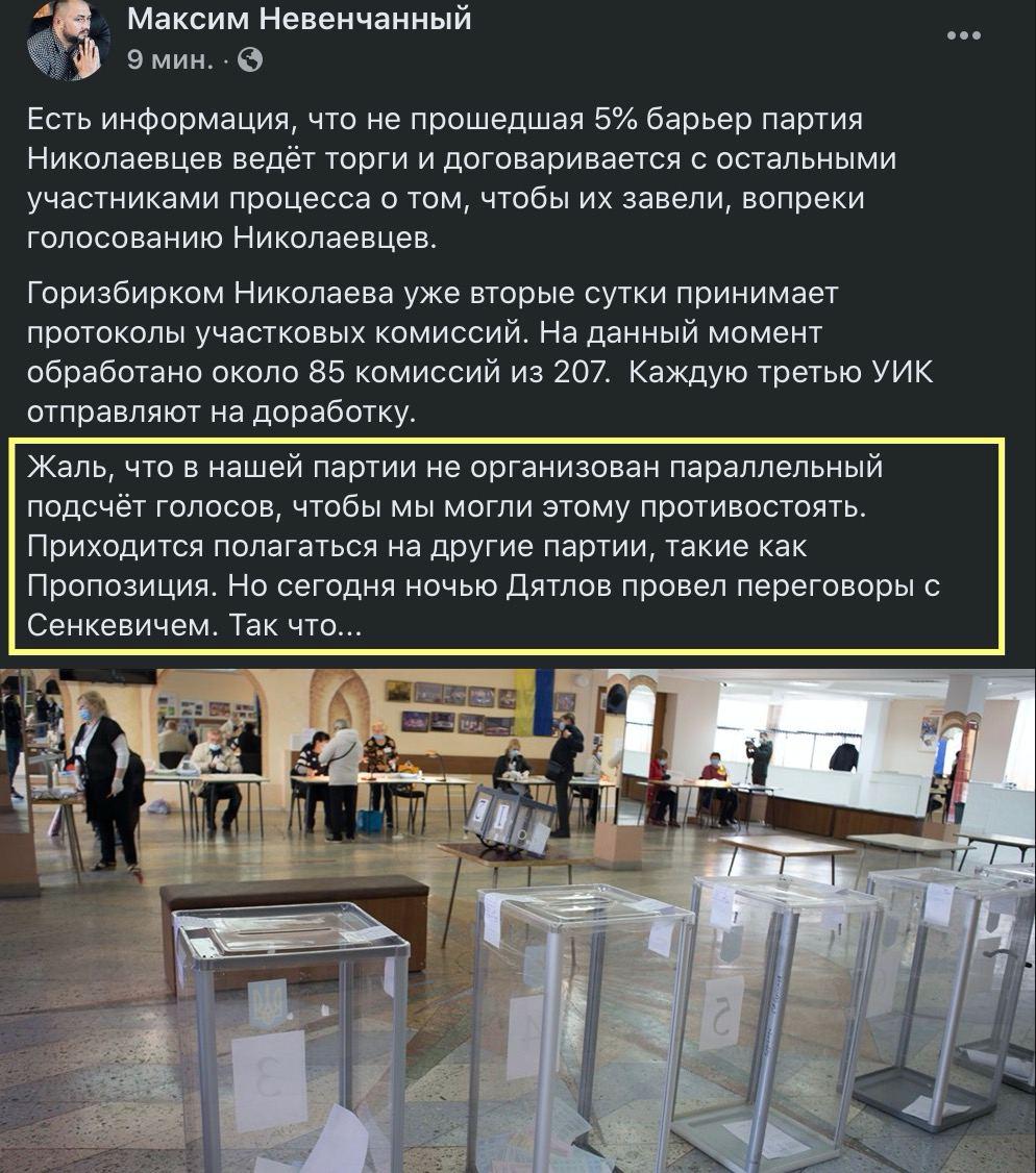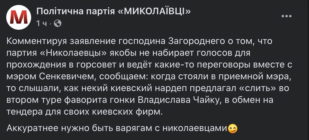 21:28 Партия «Миколаївці» опубликовала на своей странице в Facebook неоднозначное заявление.
