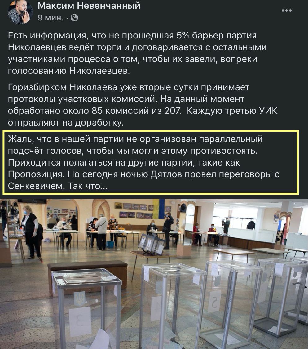 — Жаль, что в нашей партии не организован параллельный подсчет голосов, чтобы мы могли этому противостоять. Приходится полагаться на другие партии, такие как Пропозиция. Но сегодня ночью Дятлов проводил переговоры с Сенкевичем…, - написал Максим Невенчанный.