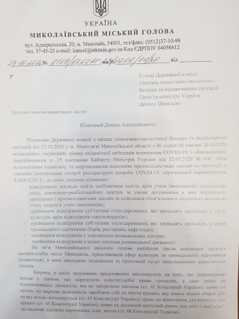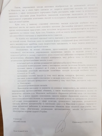 Учитывая это и принимая во внимание социальную напряженность, которая возникла в результате внедрения противоэпидемических ограничений, а также недопущения негативного влияния на экономическую ситуацию в Николаеве, необходимость сохранения рабочих мест для населения, прошу вас в рамках своих полномочий способствовать предоставлению государственной комиссией по вопросам ТЭБ и ЧС разрешения на осуществление деятельности субъектам хозяйствования в сфере культуры, общественного питания, развлекательных учреждений, детских центров и клубов, а также школ искусств в Николаеве в условиях красного уровня эпидемической опасности с ограничением относительно количества посетителей, времени работы и так далее с обязательным соблюдением противоэпидемических мероприятий и рекомендаций Министерства здравоохранения Украины», - говорится в обращении.
