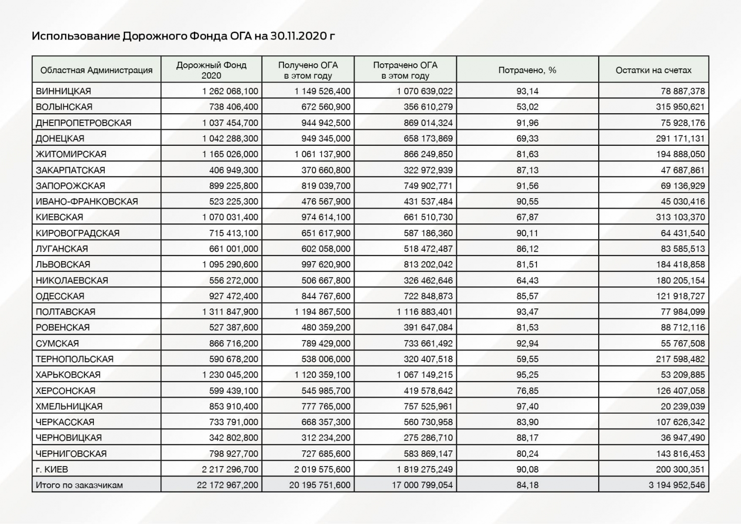 Кроме этого, лидерами по использованию Дорожного Фонда остаются Хмельницкая облгосадминистрация — 97,4%, Харьковская облгосадминистрация — 95,25%, Полтавская облгосадминистрация — 93,47%, Винницкая облгосадминистрация — 93,14% и Сумская облгосадминистрация — 92,94%.