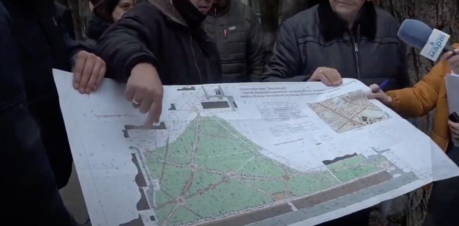 В ходе заседания перед депутатами выступил автор проекта реконструкции сквера Петр Дерменжи и заявил, что в сквере всего должны снести 63 дерева, который мешают обустройству главных аллей. При этом он также отметил, что всего разработал 5 проектов реконструкции, чтобы в конечном итоге минимизировать необходимость спила деревьев.