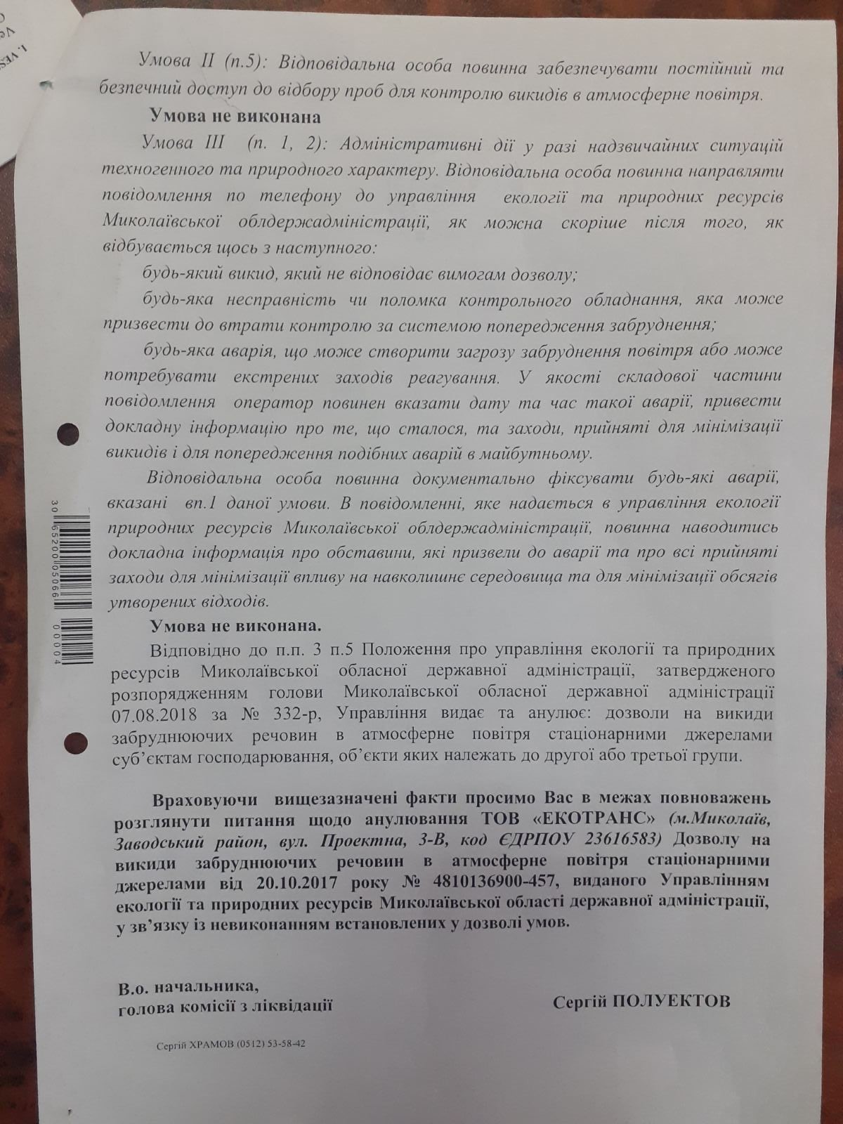В Николаевской облгосадминистрации пояснили, что не аннулировали разрешение на выбросы «Экотранса» по требованию Гоэкоинспекции из-за того, что последняя не предоставила все документы.