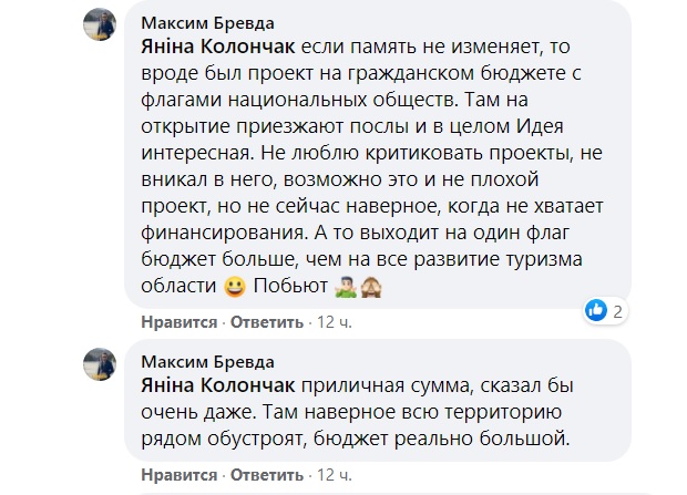 — Если память не изменяет, то, вроде, был проект на гражданском бюджете с флагами национальных обществ. Там на открытие приезжают послы и, в целом, Идея интересная. Не люблю критиковать проекты, не вникал в него, возможно, это и неплохой проект, но не сейчас, наверное, когда не хватает финансирования. А то выходит на один флаг бюджет больше, чем на все развитие туризма области, — написал Максим Бревда.
