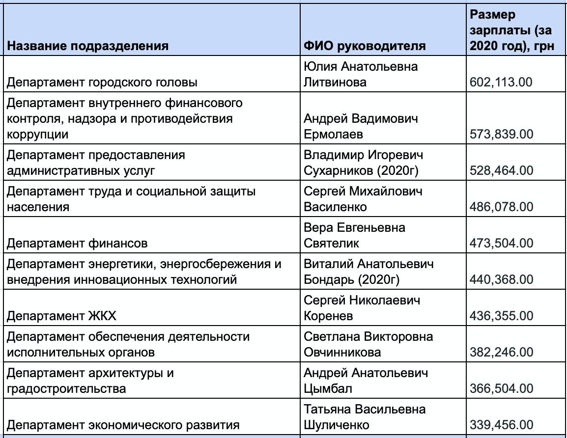 Больше всех заработала директор Департамента городского головы Юлия Литвинова. Согласно информации из поданной нею декларации о доходах за 2020 год, работая директором департамента мэрии в прошлом году она заработала 602 тысячи 113 гривен. В среднем в месяц это порядка 50 тысяч заработной платы.
