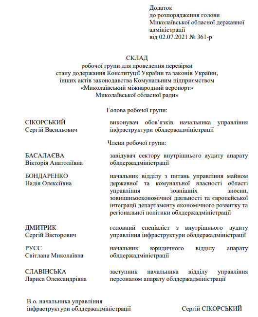 В Николаевской облгосадминистрации создали рабочую группу для проверки состояния соблюдения Конституции Украины, законов Украины и других актов законодательства коммунальным предприятием «Николаевский международный аэропорт». Распоряжение подписал первый заместитель главы ОГА Георгий Решетилов.