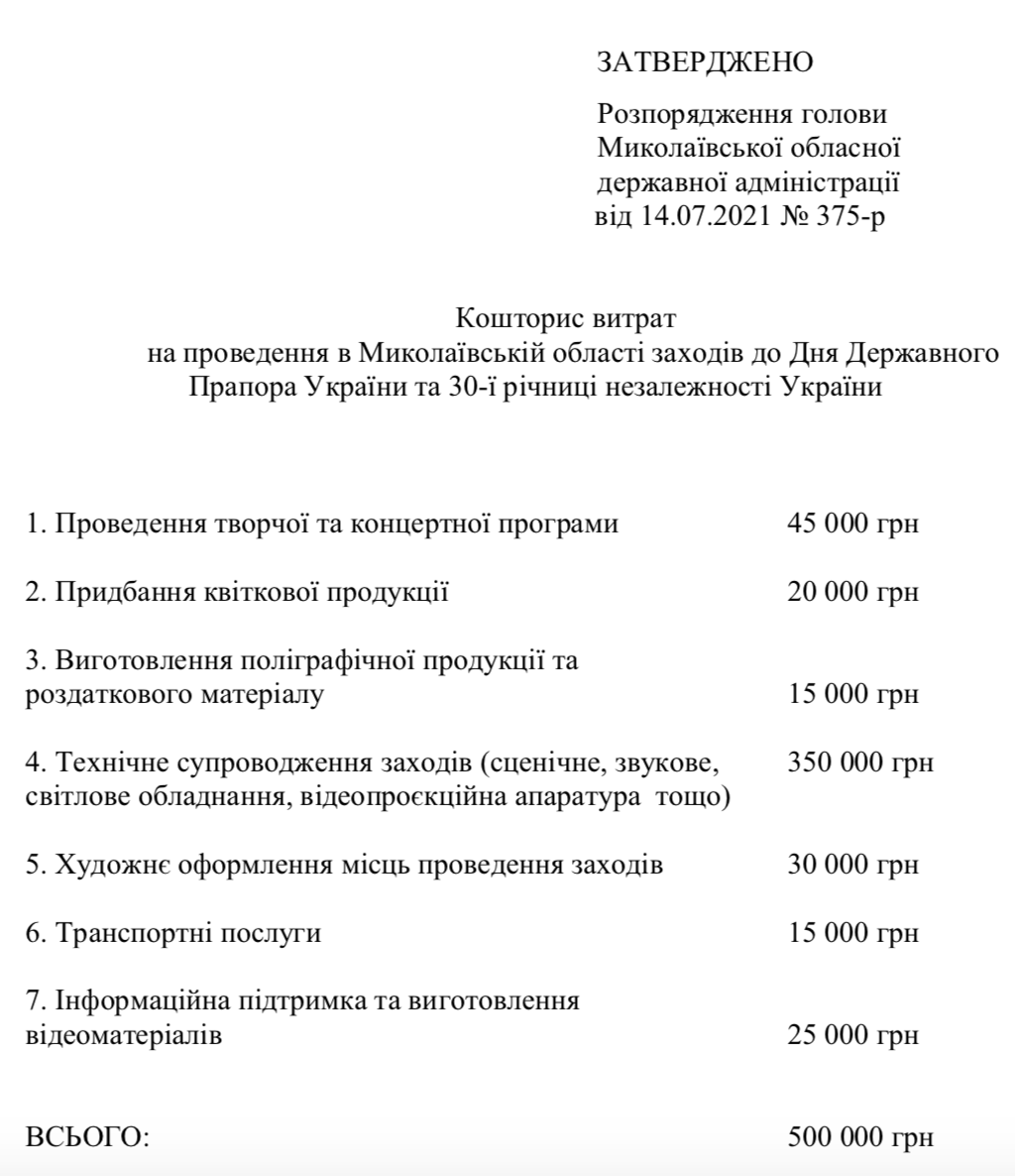 - художественное оформление мест проведения мероприятий — 30 тысяч гривен;