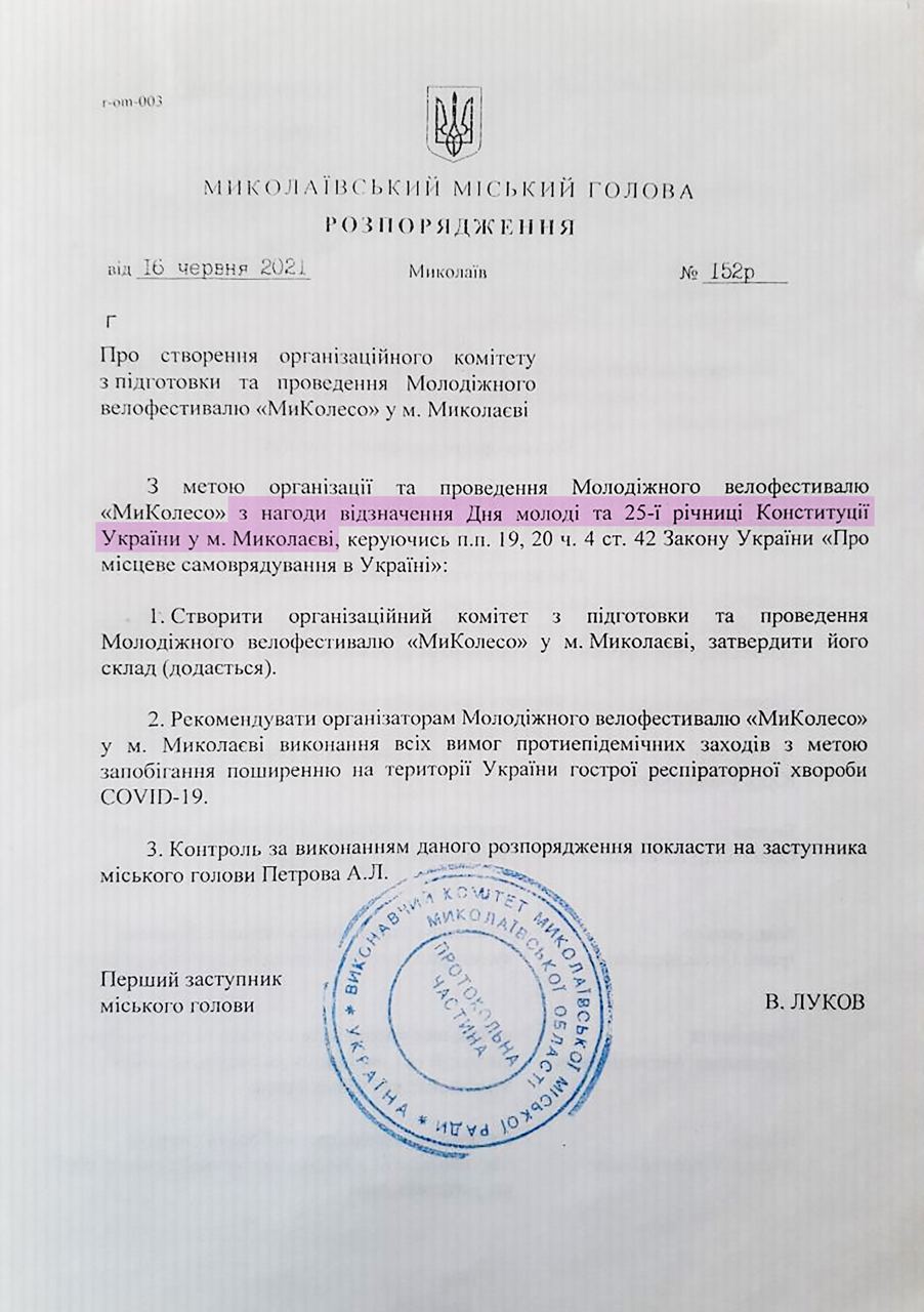 Более того, согласно распоряжению, подписанного 16 июня вице-мэром Виталием Луковым, который в тот момент исполнял обязанности городского головы, фестиваль «МыКолесо» проводили по случаю Дня молодежи и 25-летию Конституции, а не к юбилею Независимости.