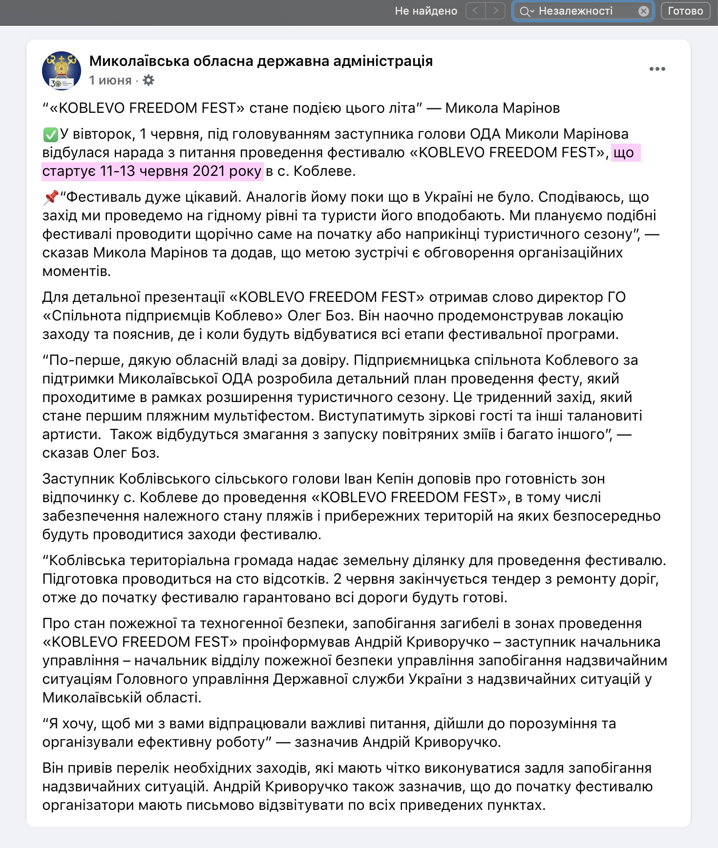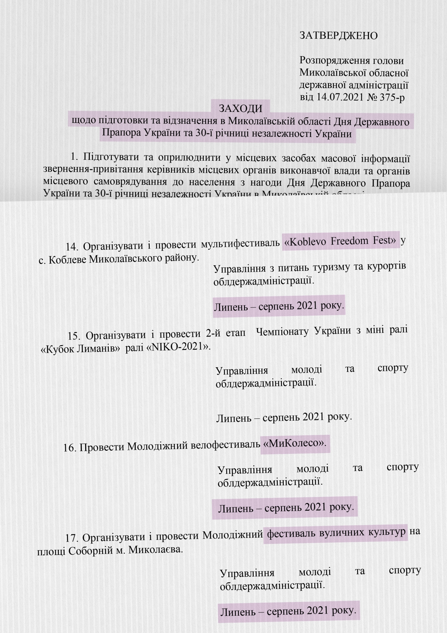 Управление культуры, национальностей и религий Николаевской ОГА включило в список мероприятий ко Дню Независимости и Дню Государственного Флага фестивали, прошедшие месяц назад. В перечне указаны фестиваль KOBLEVO FREEDOM FEST, молодежный велофестиваль «МиКолесо», которые провели в июне, а также фестиваль учличных культур Skills.