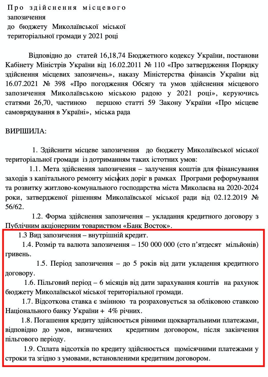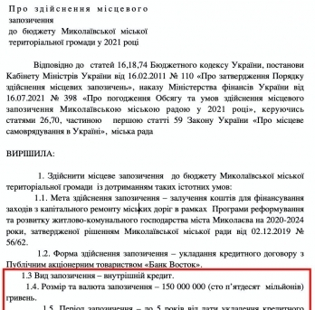 Как известно, ПАО «Банк Восток» выиграло конкурс на кредитование Николаевского горсовета на сумму 150 миллионов гривен, чтобы отремонтировать дороги в Николаеве. Банк предложил процентную ставку в размере 11,75% годовых.