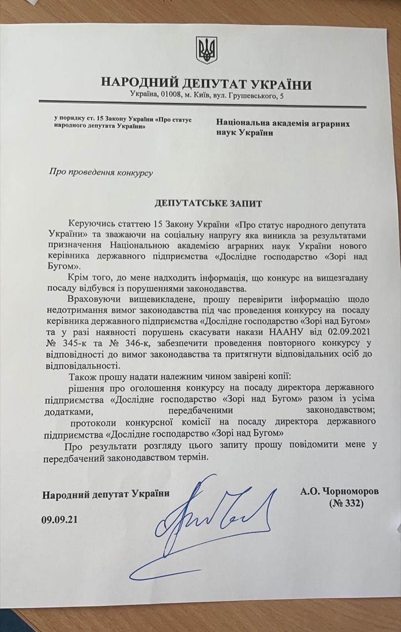 Народный депутат Украины от партии «Слуга народа», избранный по 131 округу в Николаевской области, Артем Чорноморов направил депутатское обращение в Национальную академию аграрных наук Украины по поводу конкурса по определению директора опытного хозяйства «Зори над Бугом» в Николаевской области.