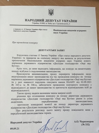 В случае выявления нарушений, нардеп потребовал отменить приказы НААНУ о назначении Сергея Коцюбы директором предприятия «Зори над Бугом», провести повторный конкурс, а ответственных лиц привлечь к ответственности.